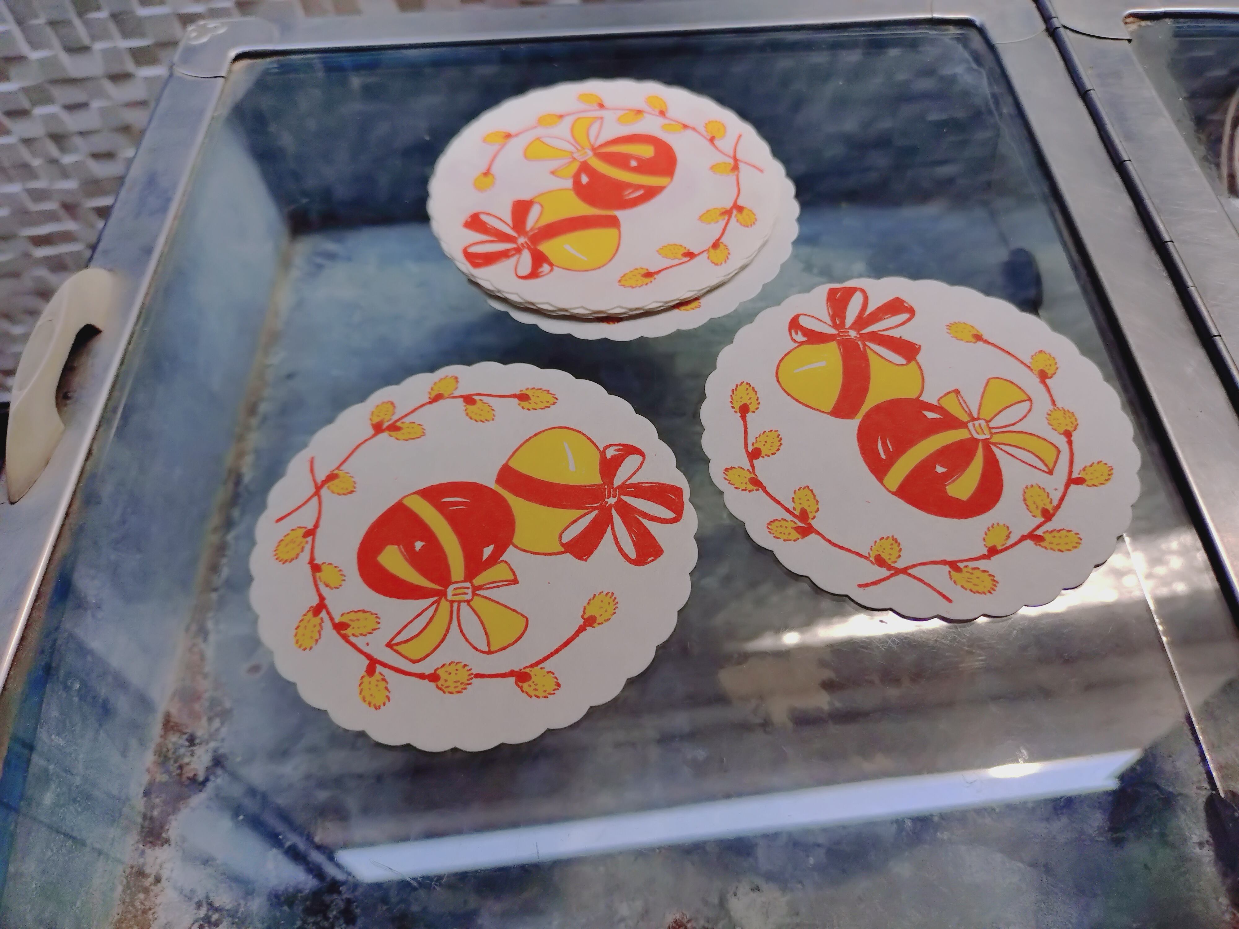 赤地に白のお花(は6枚1組)、イースターエッグ(は5枚1組)の2種です。